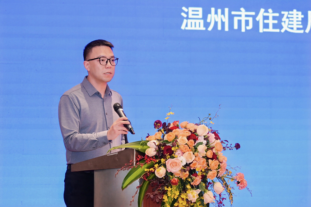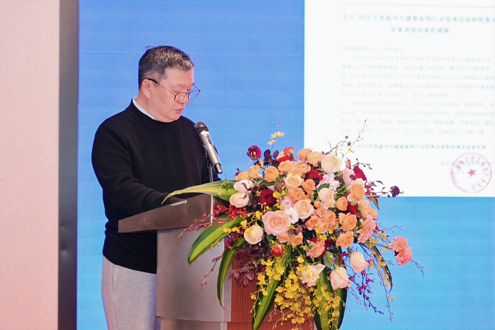 浙江省建筑装饰行业协会秘书长吴建挺讲话,他以数据的形式分析汇报浙江省建筑装饰业的发展现状。他指出,从温州的发展实践来看,城镇化进程的不断推进,不仅促进了人口集聚,还催生了多样化的装饰需求。他表示“十五五”的号角已然吹响,温州建筑装饰行业正迎来与城市共同成长的黄金发展时期,希望温州装饰企业以“敢为人先”的锐气,在数字化转型中抢占先机;以 “精益求精”的匠心,在绿色发展中树立标杆;以“胸怀大局”的担当,在城市更新中践行民生责任。