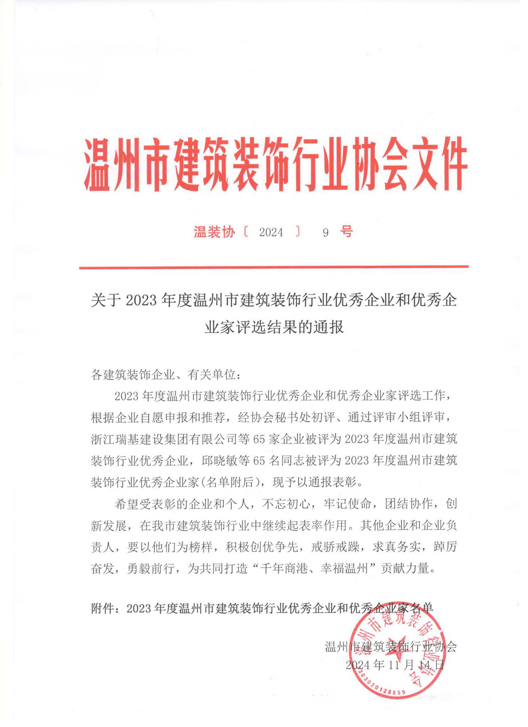 关于2023年度温州市建筑装饰行业优秀企业和优秀企业家评选结果的通报