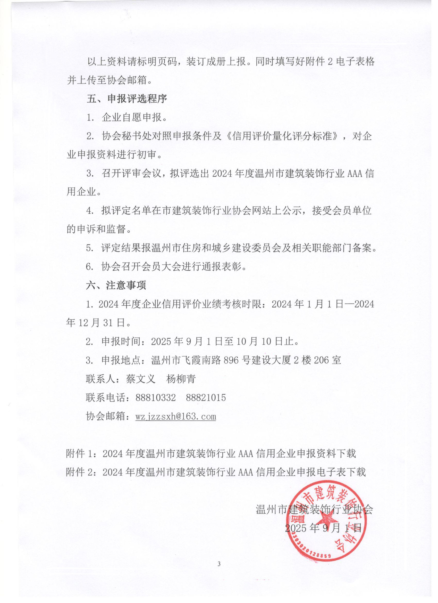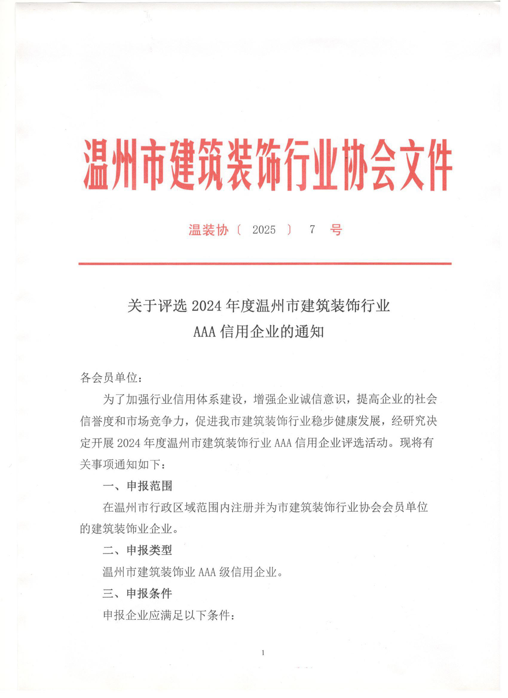 关于评选2024年度温州市建筑装饰行业AAA信用企业的通知