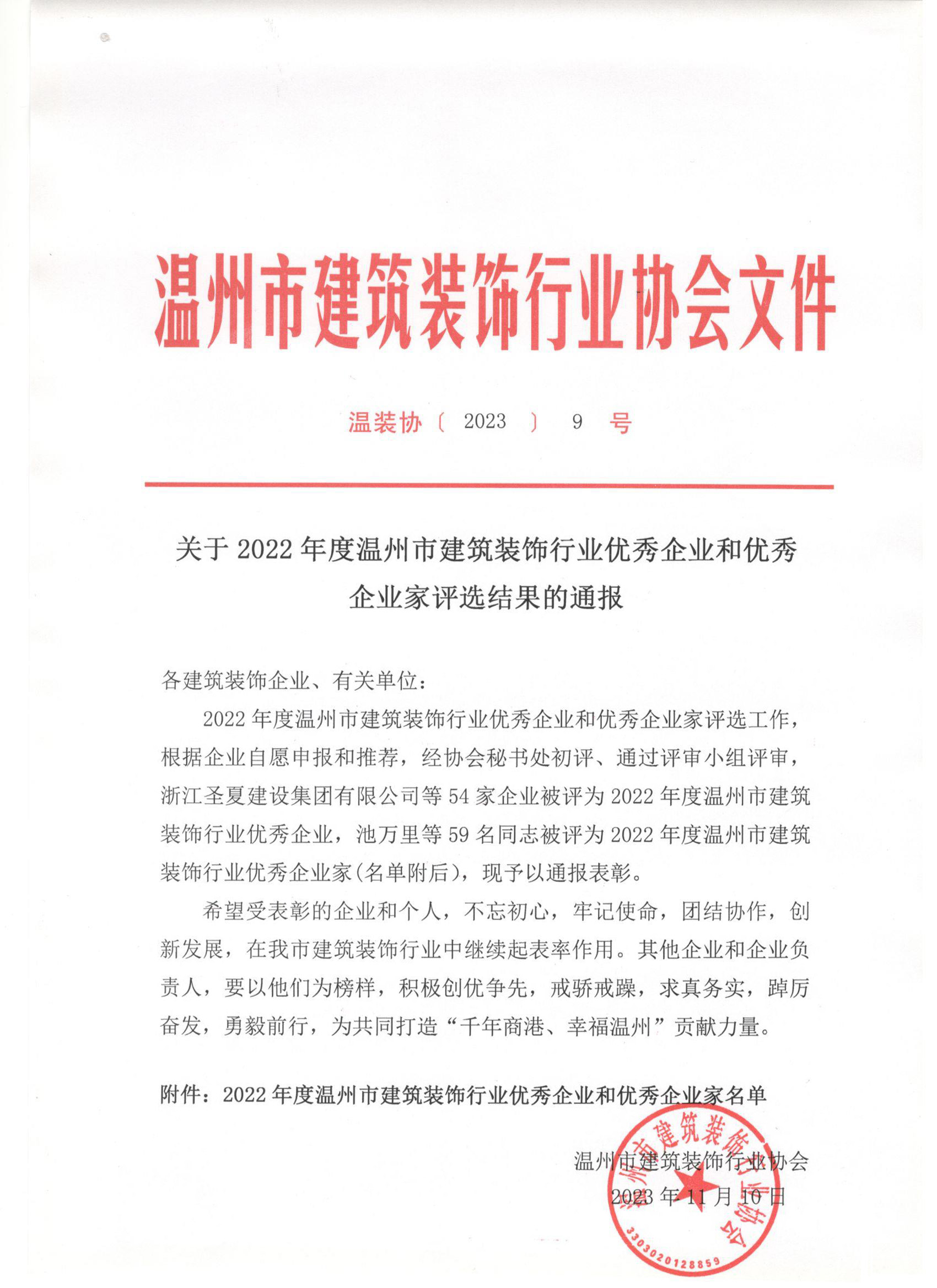 关于2022年度温州市建筑装饰行业优秀企业和优秀企业家评选结果的通报