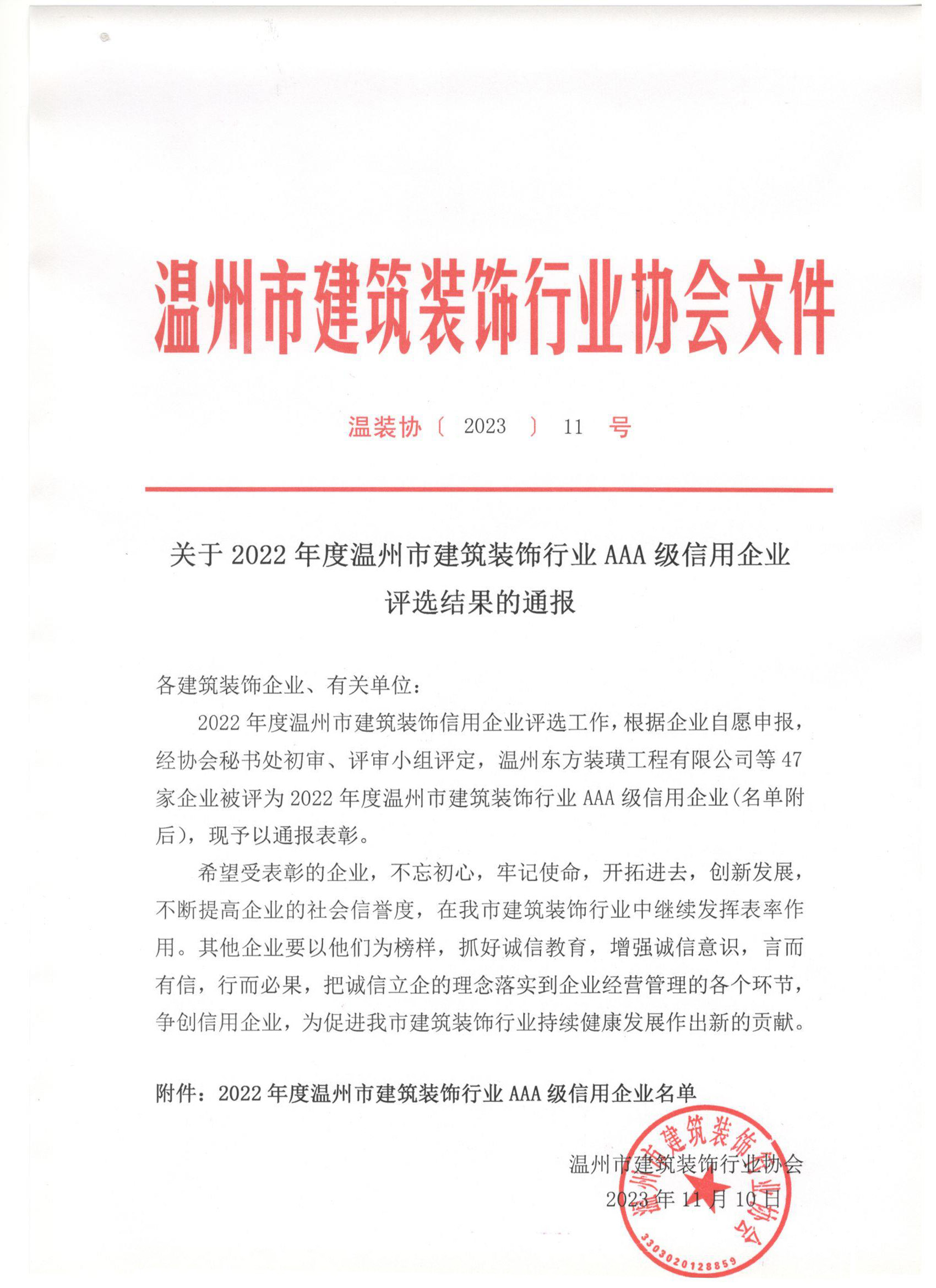 关于2022年度温州市建筑装饰行业AAA级信用企业评选结果的通报