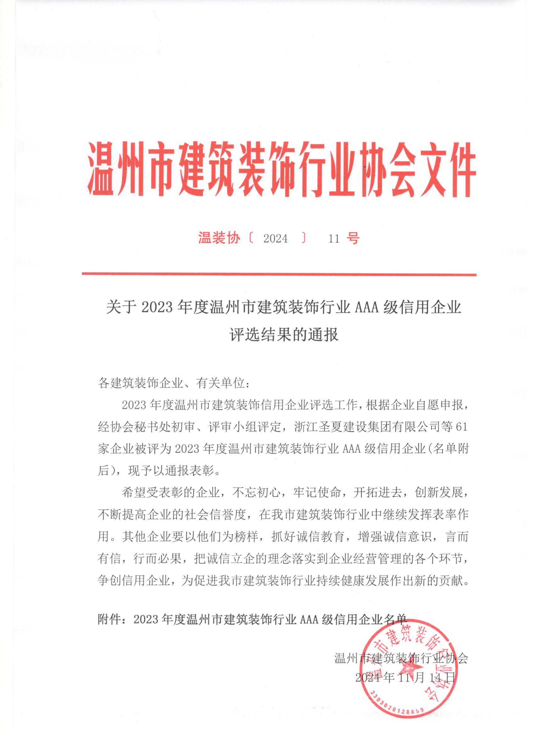 关于2023年度温州市建筑装饰行业AAA级信用企业评选结果的通报