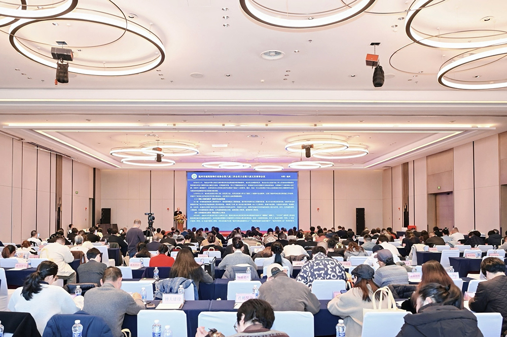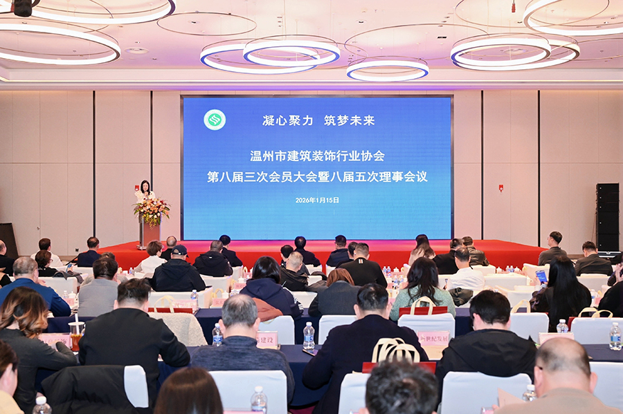 2026年1月15日,温州市建筑装行业协会第八届三次会员大会暨八届五次理事会议在温州万豪酒店隆重召开。浙江省建筑装饰行业协会原会长恽稚荣;浙江省建筑装饰行业协会秘书长吴建挺;温州市住房和城乡建设局人事处处长叶力前;温州市住房和城乡建设局建筑市场监管处处长王利祥;温州市工商业联合会组织建设部副部长陈水南;温州市建设工程招投标管理中心主任温自伟;温州市建筑市场管理总站站长金涛等领导出席。温州市建筑装饰行业协会第八届理事会会长杨越嶂、监事长周海天、党支部书记王少春、协会副会长、理事、会员代表以及嘉宾等齐聚一堂,回顾过去,擘画未来。会议由协会副会长张菁菁主持。