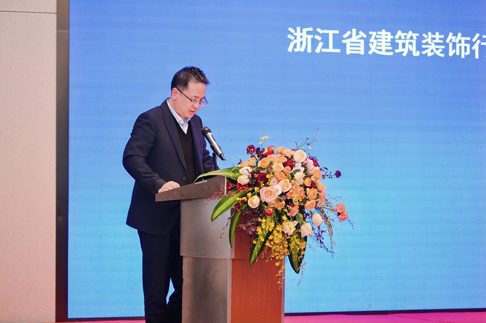 浙江省建筑装饰行业协会秘书长吴建挺讲话,他以数据的形式分析汇报浙江省建筑装饰业的发展现状。他指出,从温州的发展实践来看,城镇化进程的不断推进,不仅促进了人口集聚,还催生了多样化的装饰需求。他表示“十五五”的号角已然吹响,温州建筑装饰行业正迎来与城市共同成长的黄金发展时期,希望温州装饰企业以“敢为人先”的锐气,在数字化转型中抢占先机;以 “精益求精”的匠心,在绿色发展中树立标杆;以“胸怀大局”的担当,在城市更新中践行民生责任。