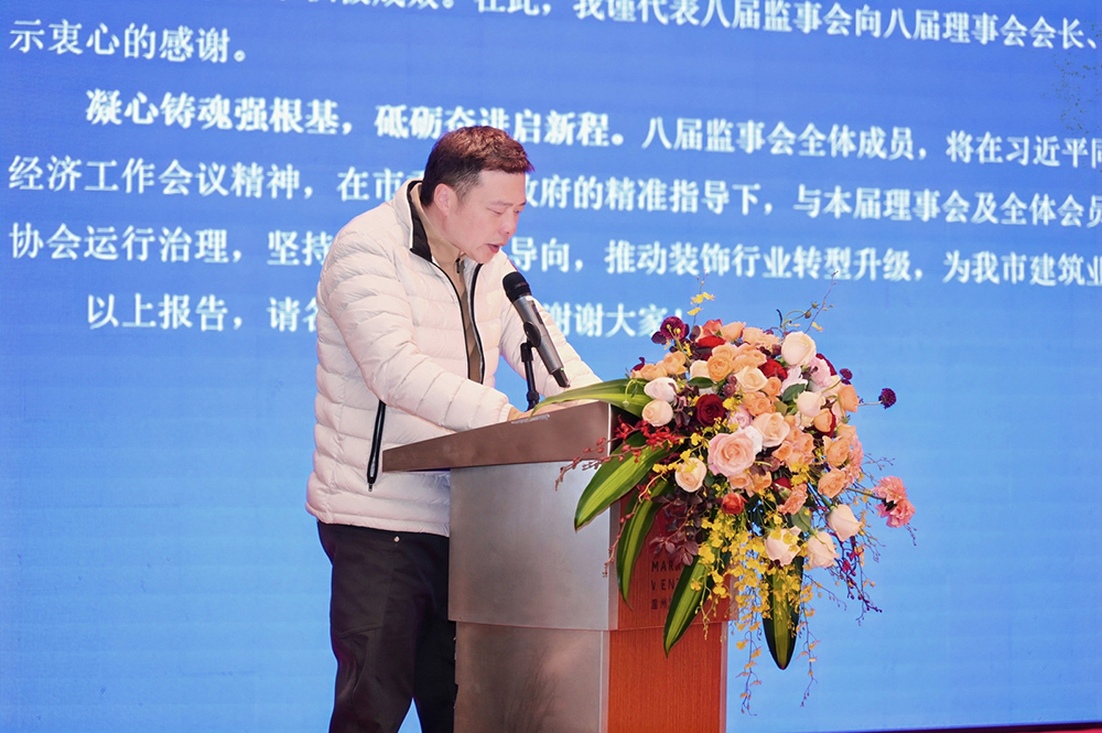 随后,温州市建筑装饰行业协会监事长周海天向大会作2025年监事会工作报告;党支部书记王少春作2025年协会财务收支情况报告;副会长周世星宣读《关于增补八届理事会理事单位的提案》;副会长张锵宣读《关于新会员入会的提案》;大会审议通过了以上报告和提案。秘书长吴小江宣读审议《关于调整会费收缴标准的提案》,会上以无记名投票方式通过了该项提案。最后,由副会长郭荣宣读了《关于2025年度优秀企业和优秀企业家评选结果通报》;副会长王建锋宣读了《关于2025年度信用企业评选结果通报》,副会长邱晓敏宣读了《关于2025年度优秀项目经理评选结果通报》。