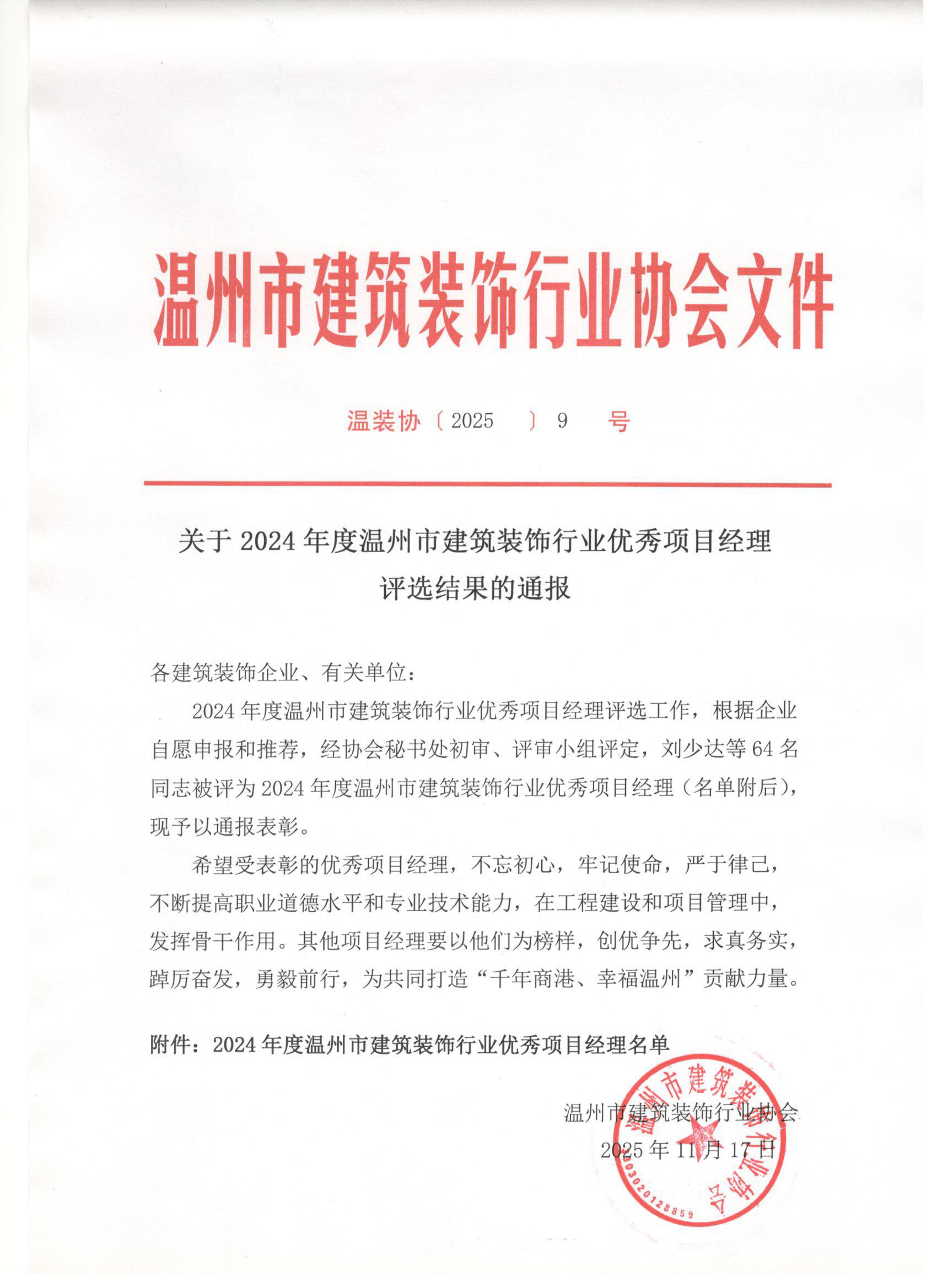 关于2024年度温州市建筑装饰行业优秀项目经理评选结果的通报